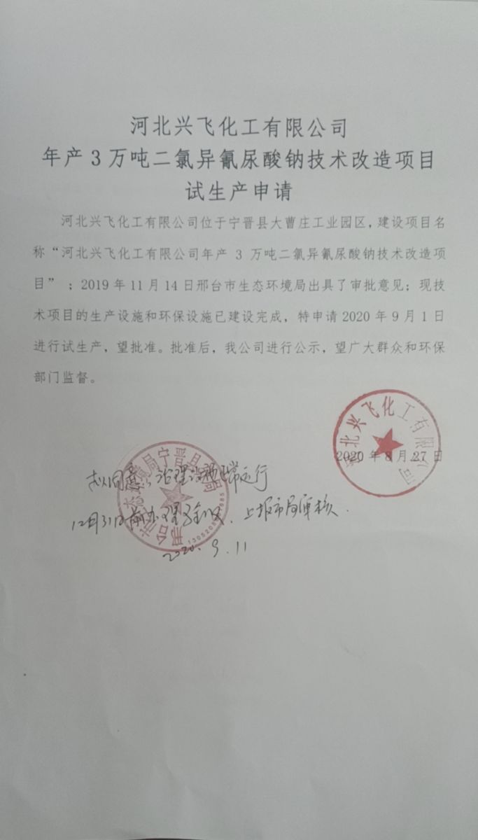 河北興飛化工有限公司年產(chǎn)3萬(wàn)噸二氯異氰尿酸鈉技術(shù)改造項(xiàng)目試生產(chǎn)申請(qǐng)